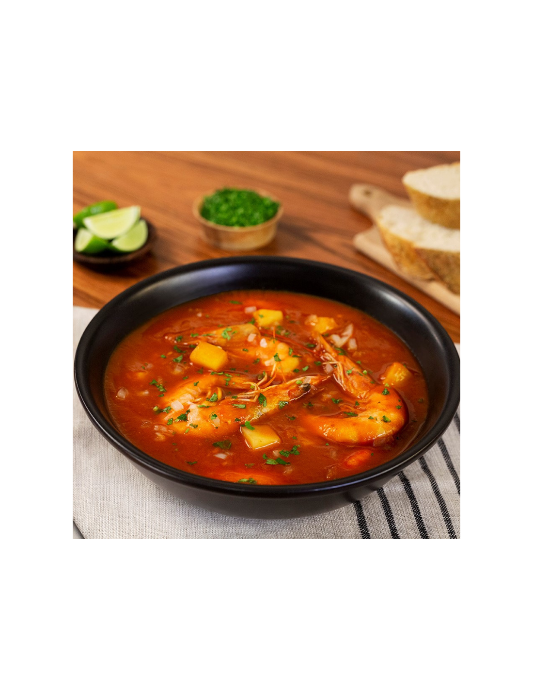 Caldo de camarón acompañado de pan y limón
